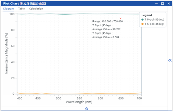 本案例中,设计了一种偏振立方使用的分光膜能够在可见光波段、45° 入射条件下p偏振光大部分透射,s偏振光大部分反射。