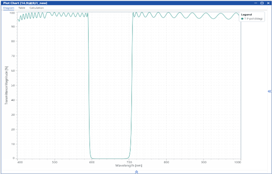 在本应用案例中,选用了常规的1/4波长堆栈作为初始结构。首先通过手动调整低折射率层和高折射率层的厚度,获得截止位置和带宽均符合要求的高反射区;随后进一步优化膜层厚度,设计出一种负滤光片,其截止范围为600–700 nm,通带覆盖400–590 nm和710–1000 nm。