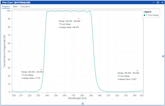 240–280 nm 波段的紫外辐射由于大气强烈吸收,难以到达地表,因此在该波段内工作的光电器件具备极低的背景噪声,相较于红外探测技术,日盲紫外探测在环境适应性和抗干扰方面具有显著优势。在本应用案例中,我们设计了一种适用于日盲紫外探测器的滤光膜。以长波通与短波通滤光膜组合为初始结构,通过优化膜层厚度,成功实现