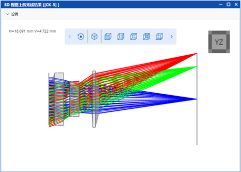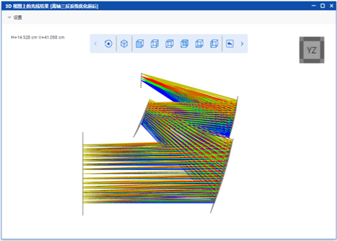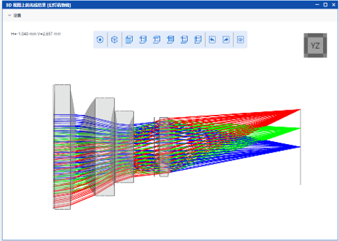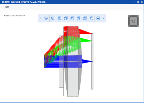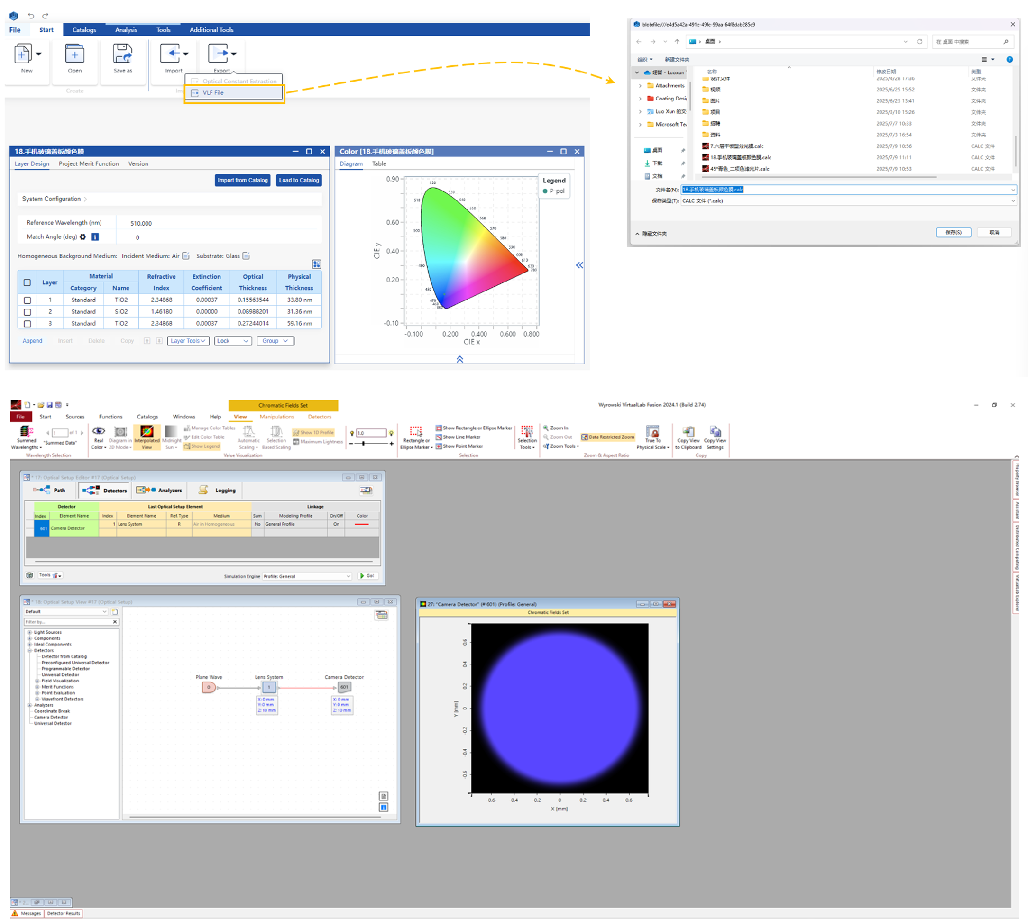 将在 VLU 中设计好的颜色膜导出为 VLF 文件,并在 VLF 中导入该文件,放置到一个简化的光学系统中进行验证。仿真结果显示反射光呈蓝色,与颜色膜的设计一致,验证了 VLU 与 VLF 之间可实现镀膜方案的跨平台共享。