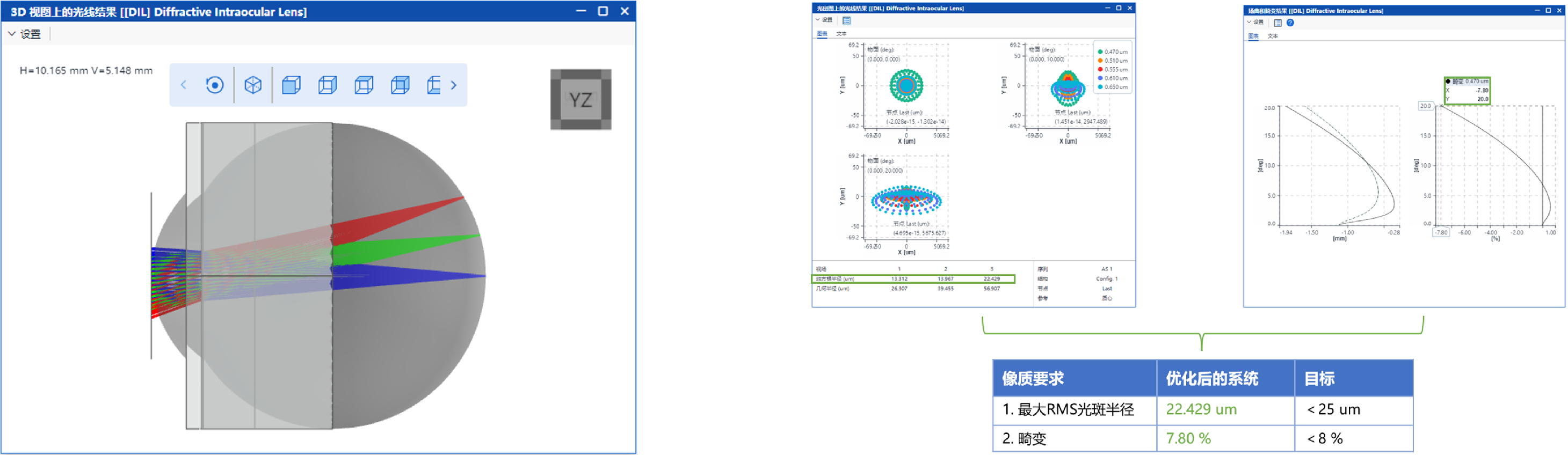 衍射式人工晶状体在现代眼科光学与视觉矫正领域中得到了广泛应用。凭借其衍射光学结构与多焦点设计,该类人工晶状体能够在单一镜片中实现多焦成像,从而在远、中、近不同视距下提供清晰视觉。衍射设计具备优异的色差补偿能力与高光学效率,能够在减少眩光与鬼影的同时提升视觉对比度与成像质量。在本案例中,将通过设计一个远视距下的衍射式人工晶状体,演示在 UniOptics 中的光学设计流程,包括初始结构生成、像质分析、评价函数定义,优化结果展示以及导出至VLF。
