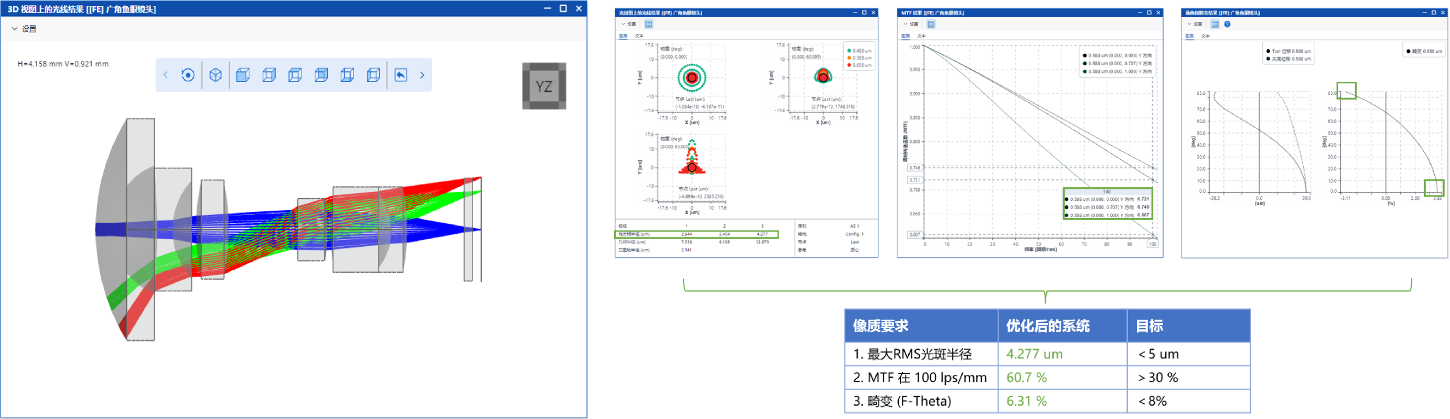 广角鱼眼镜头在全景监控、虚拟现实、无人机环视、车载辅助驾驶和科学观测等超大视场成像领域得到广泛应用。该类镜头通过极短焦距与特殊投影设计,可实现接近或超过180°的宽视场成像。鱼眼镜头通常采用多组非球面或自由曲面透镜,以校正大视角下的像差并控制畸变;在需要时还可引入衍射光学元件(DOE)以提升成像质量并减轻结构重量。在本案例中,将通过设计一个典型的广角鱼眼镜头,演示在 UniOptics 中的光学设计流程,包括初始系统生成、像质分析、评价函数定义,优化以及结果展示。