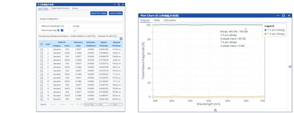 本案例中,设计了一种偏振立方使用的分光膜能够在可见光波段、45° 入射条件下p偏振光大部分透射,s偏振光大部分反射。
