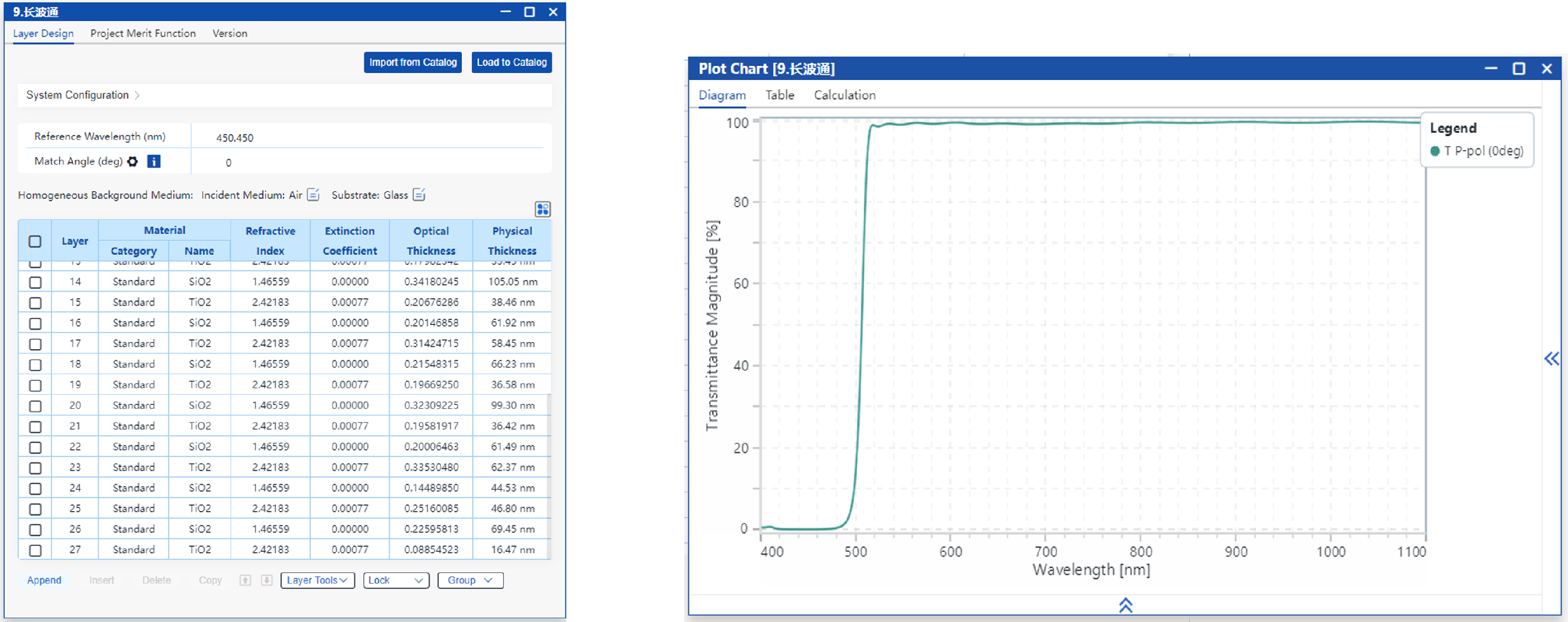 在本应用案例中,选用常规的对称周期膜系作为初始设计,并通过优化膜层厚度,成功设计出一种截止波长为 400–490 nm、通带为 515–1100 nm 的长波通滤光片。