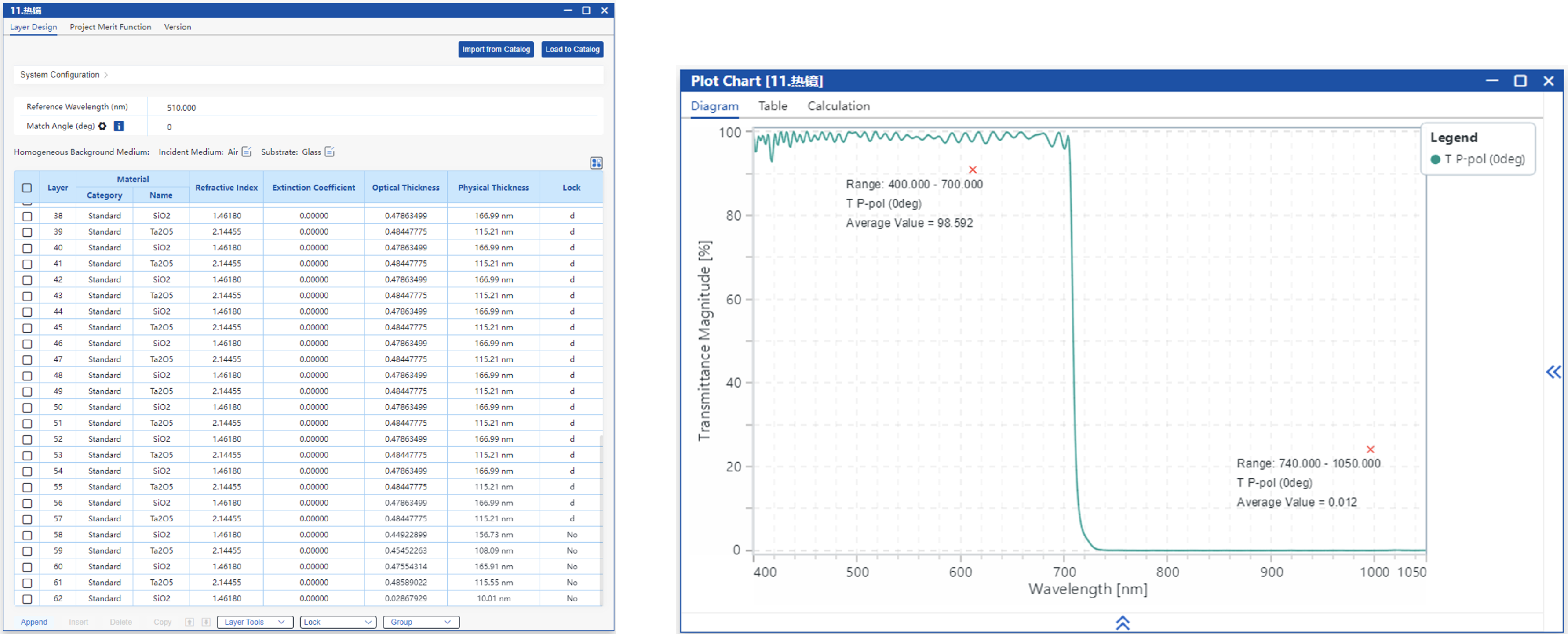 本案例中,采用多个周期的对称膜堆作为初始结构,通过拓宽截止带和减小通带波纹,设计出一种在0°入射使用的热镜。