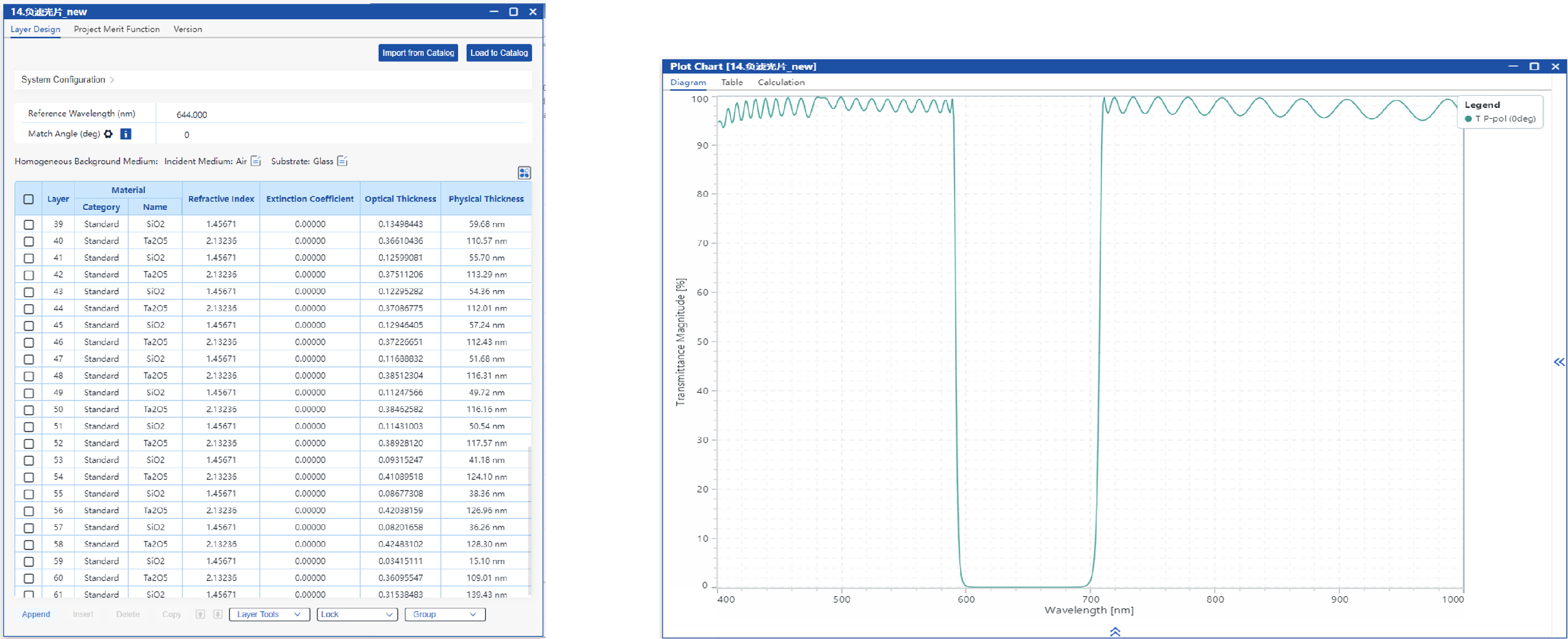 在本应用案例中,选用了常规的1/4波长堆栈作为初始结构。首先通过手动调整低折射率层和高折射率层的厚度,获得截止位置和带宽均符合要求的高反射区;随后进一步优化膜层厚度,设计出一种负滤光片,其截止范围为600–700 nm,通带覆盖400–590 nm和710–1000 nm。
