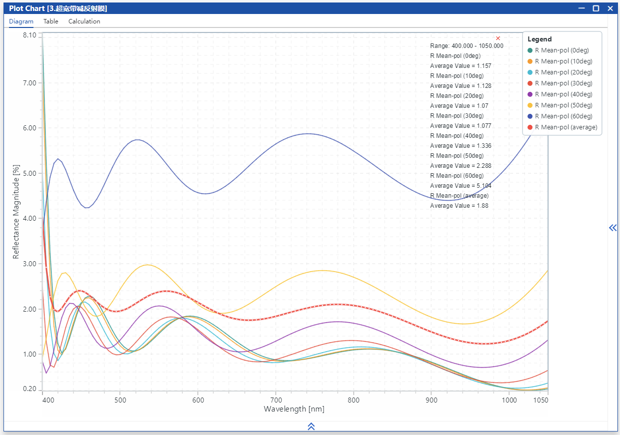 通过初始结构设计和后续优化,设计出一种适用于 400–1100 nm 波段的多层减反射膜,在倾斜入射条件下依然表现出优异的减反射性能。