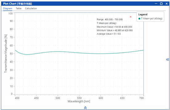 本案例中,通过分别设计分光膜与减反射膜,并将其分别镀制在平板基板的两侧,成功实现了一种在可见光波段、45° 入射条件下具有 50:50 分束比的平板型中性分光镜。