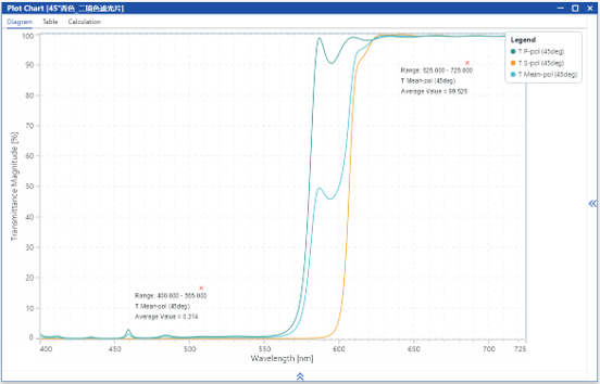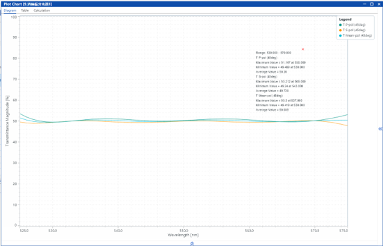 消偏振分光膜是一种在特定入射角下实现偏振无关分光的光学薄膜。相比普通分光膜对p光和s光存在明显的透射或反射差异,消偏振分光膜对于不同偏振态的光具有接近一致的光谱性能,从而实现对偏振状态不敏感的分光效果。本案例中,成功实现了一种在530 nm-570 nm波长、45° 入射条件下具有 50:50 分束比的消偏振分光膜