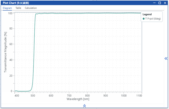 在本应用案例中,选用常规的对称周期膜系作为初始设计,并通过优化膜层厚度,成功设计出一种截止波长为 400–490 nm、通带为 515–1100 nm 的长波通滤光片。