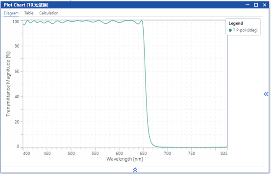 在本案例中,选用常规的对称周期膜系作为初始设计,并通过优化膜层厚度,成功设计出一种通带为400–650 nm、截止带为 676–820nm 的短波通滤光膜
