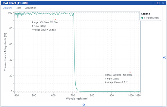 热镜能够透过可见光,同时反射超过90%的近红外和红外光,在投影系统中能够有效减少热量进入系统,防止因热积聚而造成投影系统损坏,因此是投影系统中的理想选择。本案例中,采用多个周期的对称膜堆作为初始结构,通过拓宽截止带和减小通带波纹,设计出一种在0°入射使用的热镜。