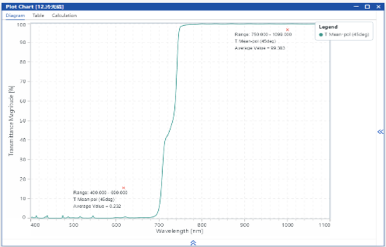 本案例展示了一个专为45°入射条件设计的反射型二向色性青色滤光膜。该膜系能够有效反射蓝绿波段的光,同时透过红光,使其在反射视角下呈现青色效果。