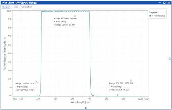 投影机中所使用的隔红外紫外滤光片的主要作用是滤除灯源光谱中的紫外光和红外光。420 nm以下的紫外光会对光学芯片造成损伤,而700 nm以上的红外光会导致芯片温度升高,进而影响其寿命。此外,红外波段对图像亮度的贡献可以忽略,因此通常需要滤除波长小于420 nm和大于 700 nm的光谱成分。在本案例中,通过先分别构建长波通和