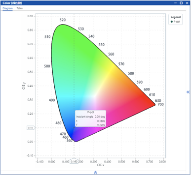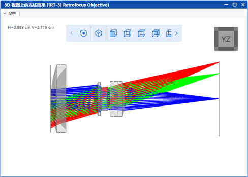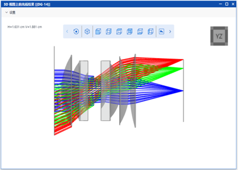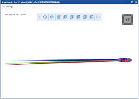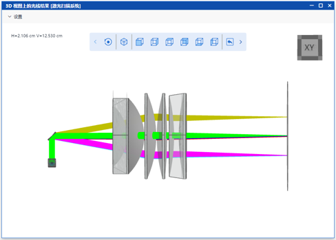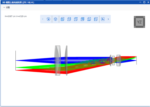 将在 VLU 中设计好的颜色膜导出为 VLF 文件,并在 VLF 中导入该文件,放置到一个简化的光学系统中进行验证。仿真结果显示反射光呈蓝色,与颜色膜的设计一致,验证了 VLU 与 VLF 之间可实现镀膜方案的跨平台共享。