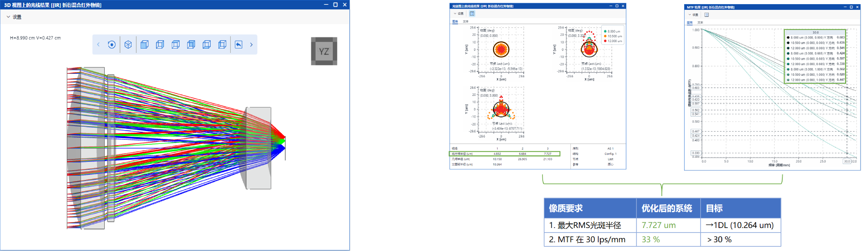 折衍混合红外物镜在军用监视、航天/无人机红外遥感、工业热成像与科学观测等高精度红外成像领域得到越来越广泛的应用。凭借将衍射光学元件(DOE)与折射透镜耦合的混合设计,该类镜头能够在宽波段或多波段红外成像条件下实现优异的色差校正与像质控制,同时兼具重量小、结构简化、对热漂移(thermal shift)更鲁棒等优势。在本案例中,将通过设计一个典型的折衍混合红外物镜,演示在 UniOptics 中的光学设计流程,包括初始系统生成、像质分析、评价函数定义、优化。