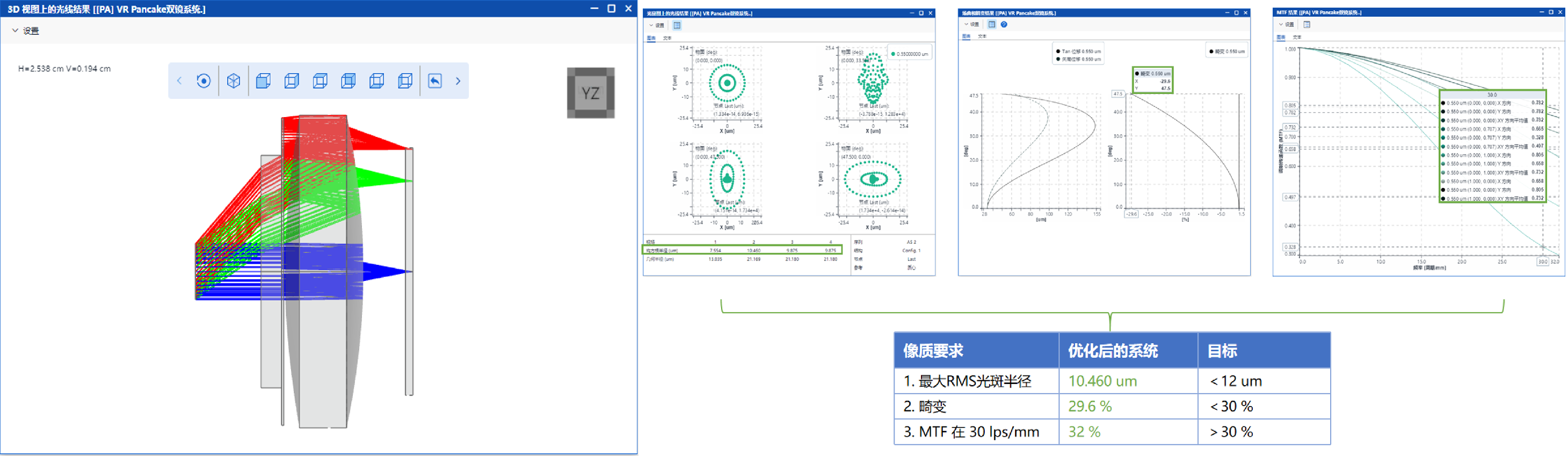 Pancake 镜头近年来在虚拟现实(VR)头显中得到越来越广泛的应用。凭借将折叠光路的反射式光学结构与偏振光学元件(如PBS、λ/4波片)相结合的创新设计,该类镜头能够在极大缩短系统光路长度的同时,实现高分辨率、低畸变的成像表现,从而显著减小头显体积与重量。相比传统菲涅尔透镜(Fresnel Lens),Pancake 镜头具备更高的紧凑性、像质一致性以及边缘清晰度优势,但对制造精度与透光率控制要求更高。在本案例中,将通过设计一个典型的 Pancake 光学系统,演示在 UniOptics 中的光学设计流程,包括初始系统生成、像质分析、评价函数定义与优化。