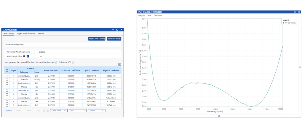 在本应用案例中,通过选用成熟的初始结构并对其厚度进行进一步优化,设计出一种基于硫系玻璃的长波红外减反射膜。