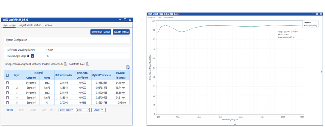 在本应用案例中,通过合理的初始结构设计并结合后续优化,我们设计了一种金属-介质高反膜,能够在可见光和近红外都提高都具有良好的反射效果,满足了天文观测要求。
