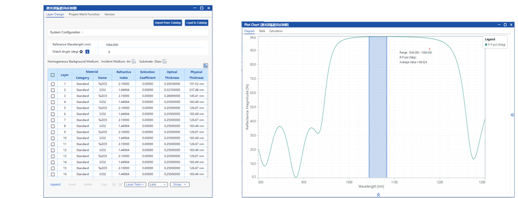 在本案例中,针对Nd:YAG激光器的谐振腔,我们基于λ/4膜堆结构,通过理论分析确定了的初始膜系设计;同时利用电场分布分析对膜层结构进行优化,使得在满足高反射率要求的同时,薄膜整体的激光损伤阈值得到了显著提高。