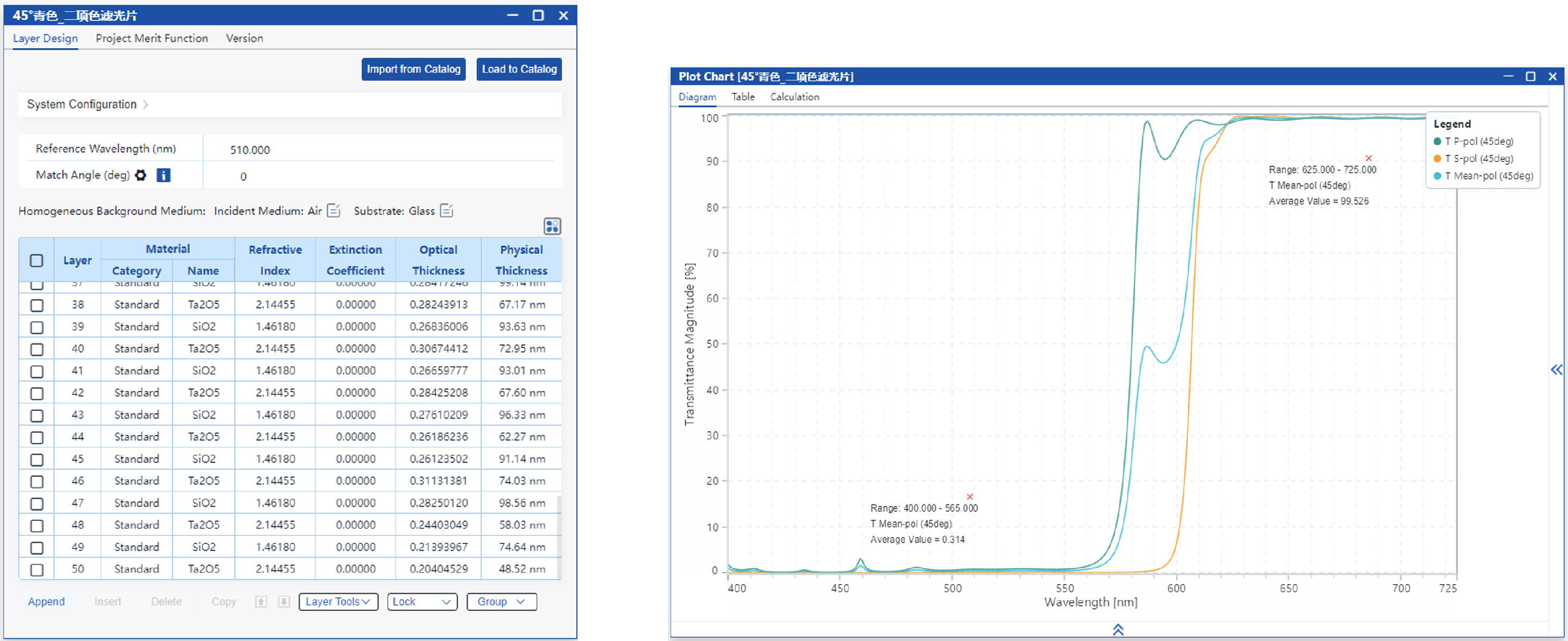 本案例展示了一个专为45°入射条件设计的反射型二向色性青色滤光膜。该膜系能够有效反射蓝绿波段的光,同时透过红光,使其在反射视角下呈现青色效果。